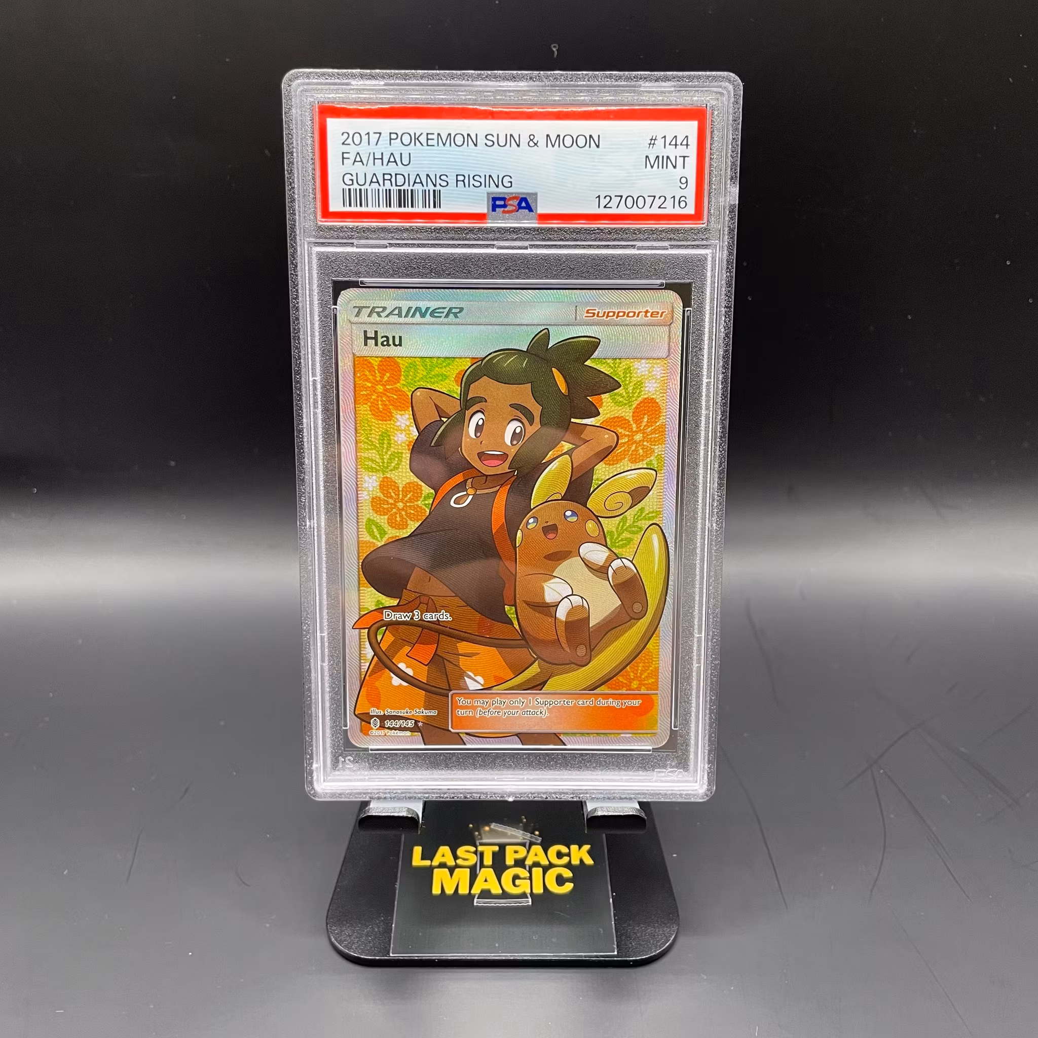 Ett graderat kort från PSA som fått näst högsta betyg, 9 av 10. Detta kort är från 2017 och ca 9 år gammalt. På detta kort ser ni tränaren Hau ihop med sin Pokémon Alolan Raichu.